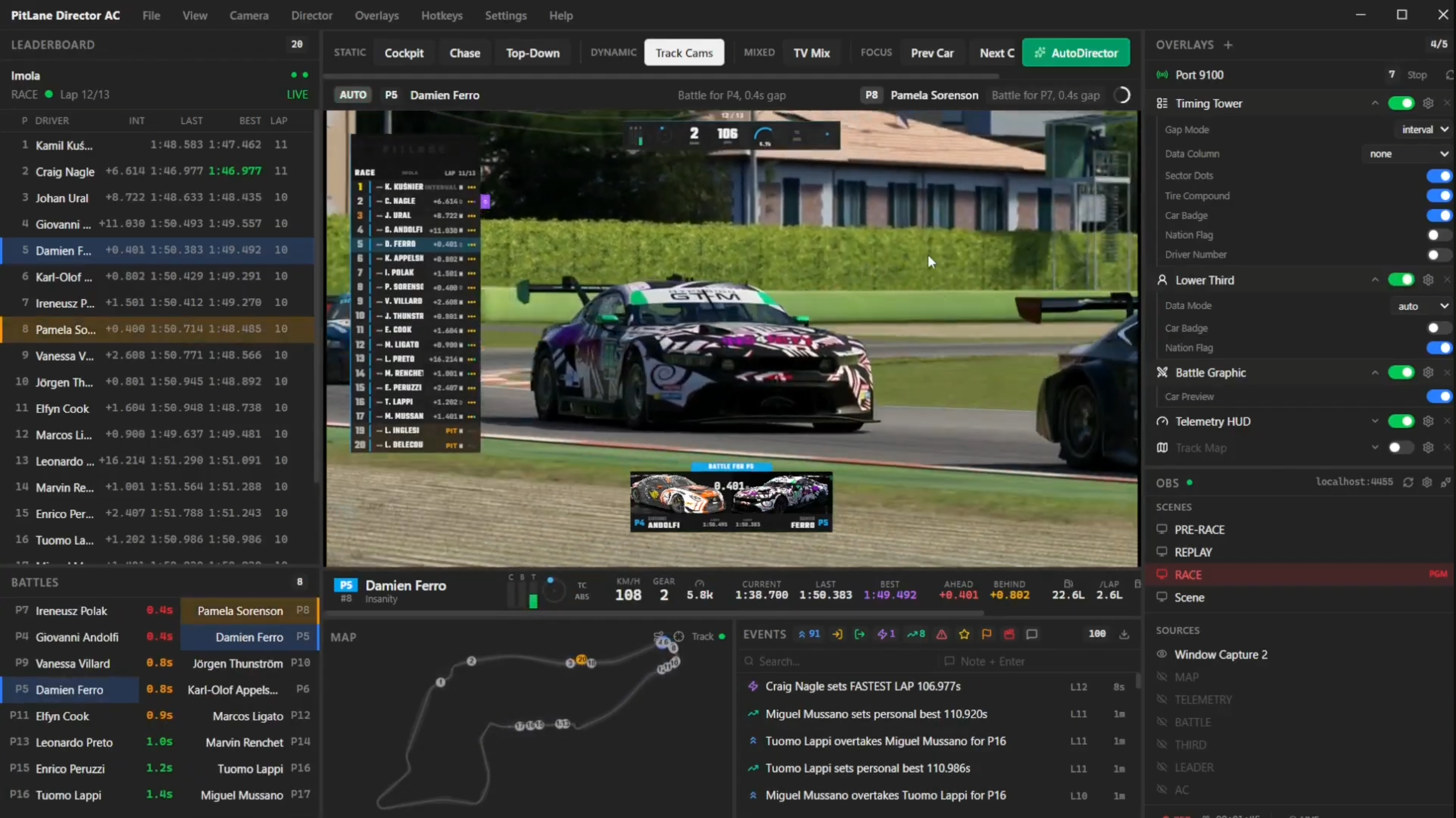 PitLane Director gives a single operator the situational awareness and production control of a full TV broadcast team — purpose-built for Assetto Corsa league racing.